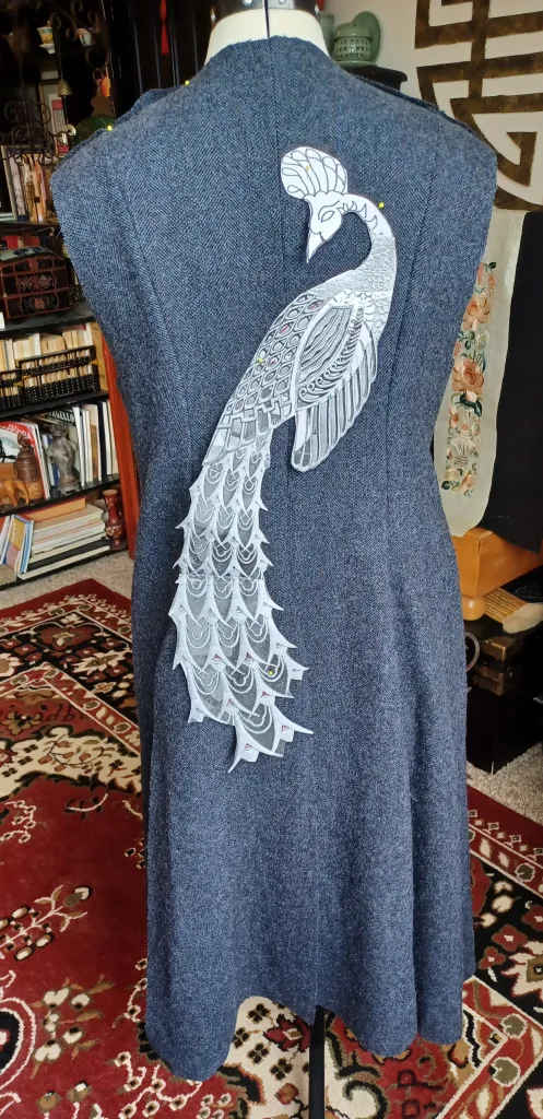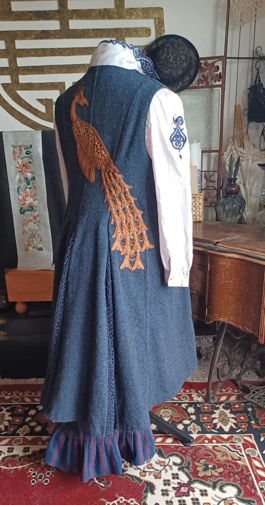 After an estimated 300 hours of work over the span of 2 years, I am happy with the results. The front hangs smooth and straight, while the back flows over my bustle with the aid of three lace inset gores. I am now preparing to repeat this peacock on a shorter jacket made from pieced herrringbones, with the peacock itself executed in black leather (a Goth Peacock!)