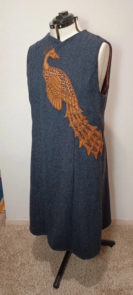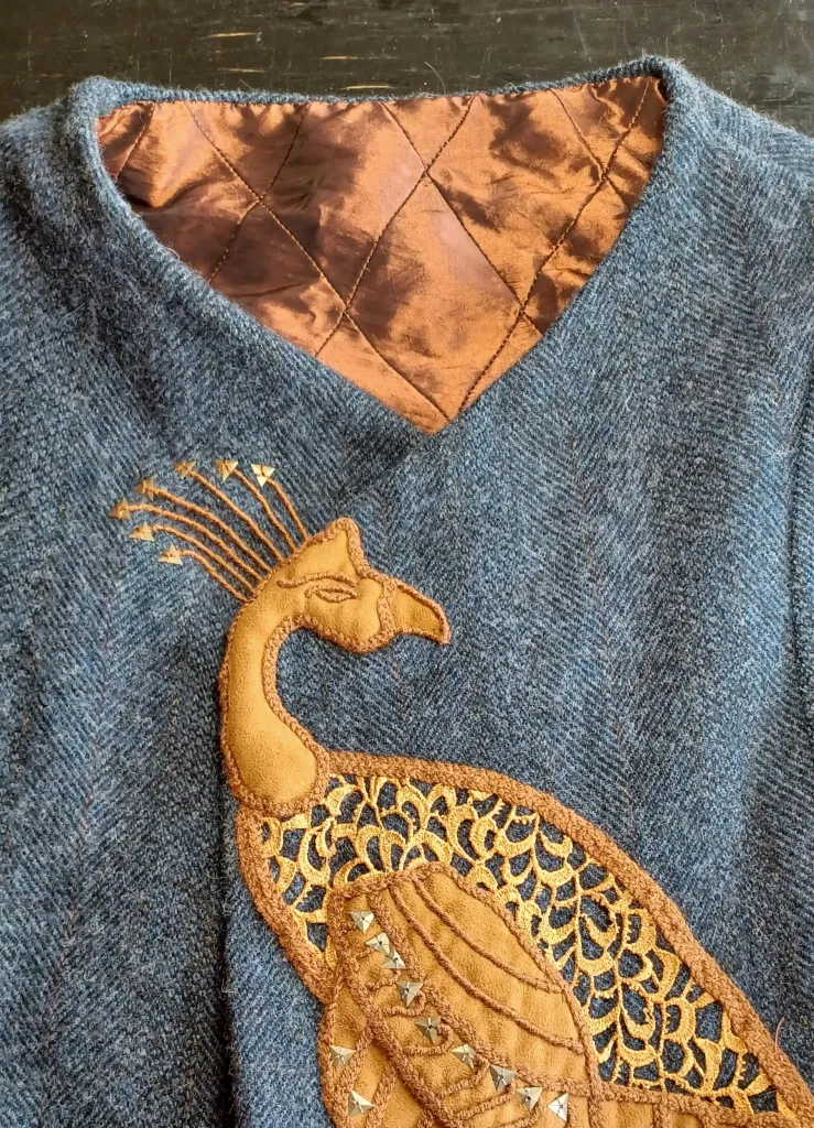 I had planned to make the lace gores rust colored as well, but I only had enough paint for the peacock, so I turned to dye. But my test pieces came out maroon! A navy dye worked better; it was a good color match to the wool, and the gores would be more subtle and less of a distraction from the overall design. Another modification occurred when I tried to shape the front closure, and found that the wool curved naturally around the peacockโs head and neck – a very happy accident. (Not shown here is the hook closure behind the peacockโs head.)