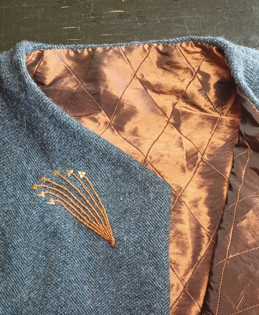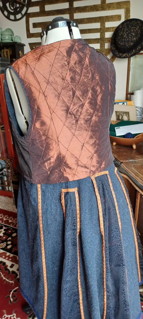 In spite of my best efforts to avoid it, I ended up lining the upper portion of this garment where the applique had required anchoring. I finished the seams around the lace insets with a rust and silver ribbon, and added a single pocket to the right side under the overflap.