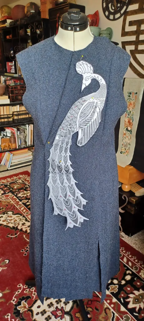 My stash of recycled textiles yielded a lovely blue herringbone wool for the body, and a rust colored suede cloth for the peacock which would replicate the bronze color of the Tiffany doors. I made several photocopies of the photos I had taken of the Tiffany doors, and played with them on my drawing board before transferring them to the dress form, where I revised the posture of both birds so they would be asymmetrical.