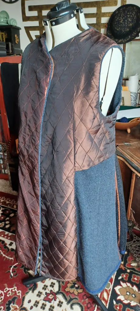 I started with Folkwearโs Model T Duster pattern as the base garment. Although I had planned to add additional gores both front and back in order to make a fuller skirt, fitting the pattern to my dress form showed me that I only wanted one additional gore at the center back, in addition to the two that the pattern called for. I constructed this garment as a sleeveless tunic-length vest to increase its versatility.