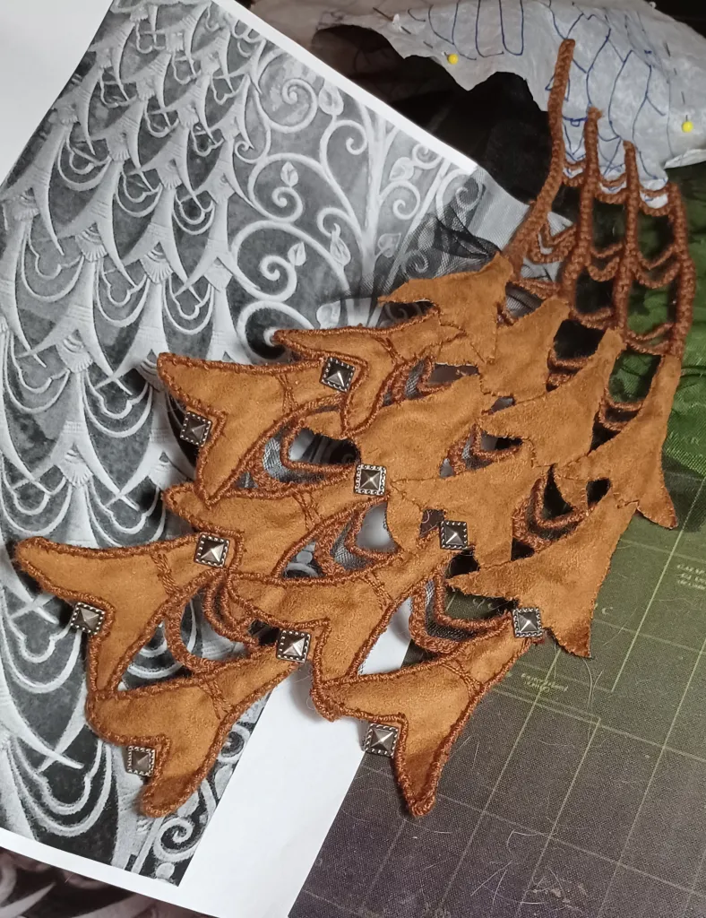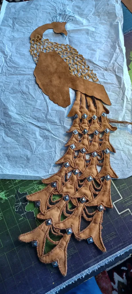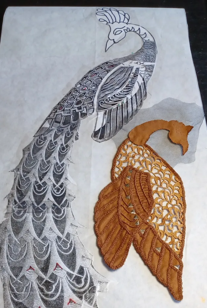 I ย found that I needed to do a lot more embroidery than I had planned. I added metal studs to the tail feathers after abandoning the colored and bezeled jewels I had collected for this project. I also ended up working the body and tail as separate pieces. A friend had donated a tatted wedding dress, which was perfect for replicating the filigree of the Tiffany door. I cut a piece for the body of the peacock and painted it with acrylic. The body would ultimately prove to be more fragile and time consuming than the entire tail.