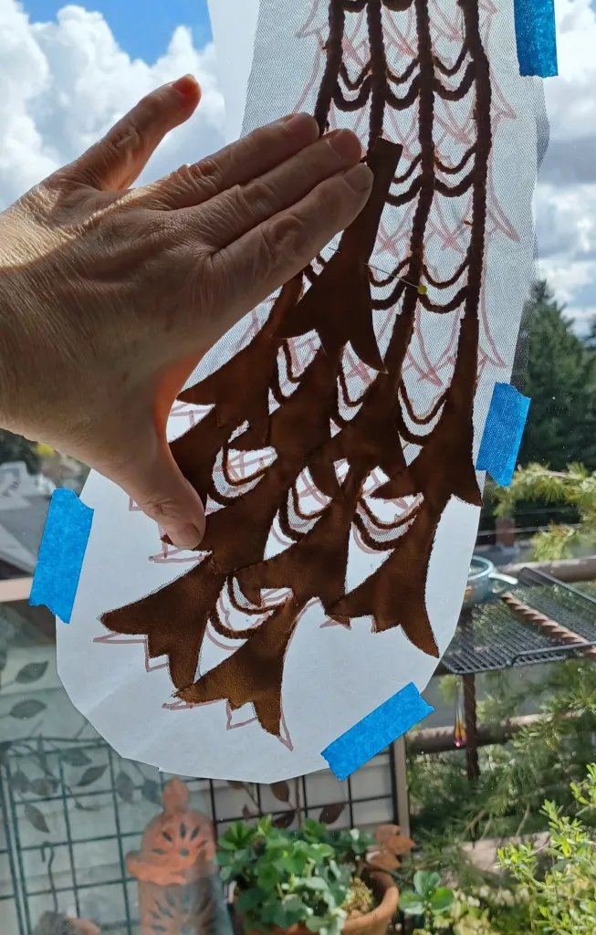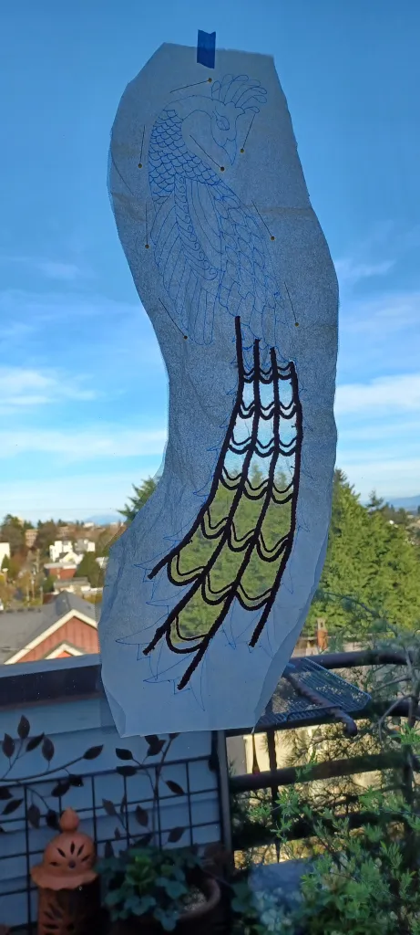 Since the design was complex and I didnโt plan to line the garment, I worked each peacock on navy tulle so I could applique them to the vest as single pieces and minimal โsew throughโ embroidery. I traced the design from the photocopy onto tissue paper, which acted as a stabilizer to the tulle. The photos below show me using a window as a light-box for this tracing. I braided yarn to lay as the tail feather spines and connector pieces, which acted as guides for positioning the suede cloth โfeathersโ.